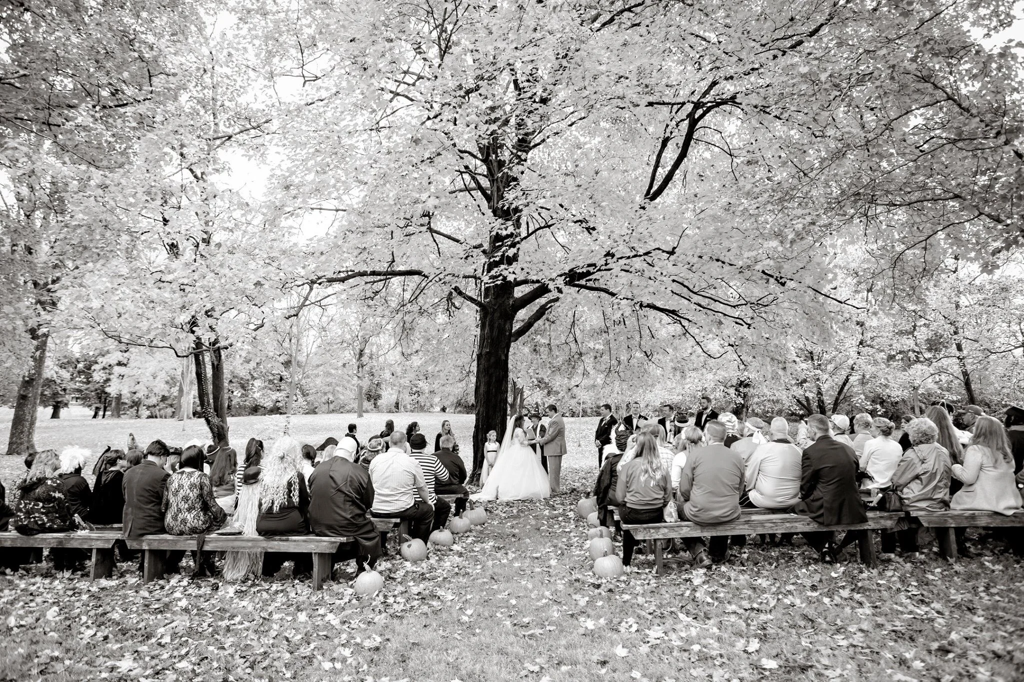 It stopped raining just minutes before the music began and the bridesmaids and groomsmen began their walk down the isle. As Moon River, an instrumental version, began playing, my dad ushered me out of those historic double doors on the front of the mansion and down the porch. We walked up to the ceremony site, with guests dressed in their Halloween costumes filling benches on both sides. The isle was covered in red and orange fall leaves, and pumpkins lined each row of benches. Our officiant was dressed in her Mickey Mouse Wizard cloak and hat, with wand in hand. Joe was grinning ear to ear, with a makeshift noose around his neck. It was everything we dreamed of and more.